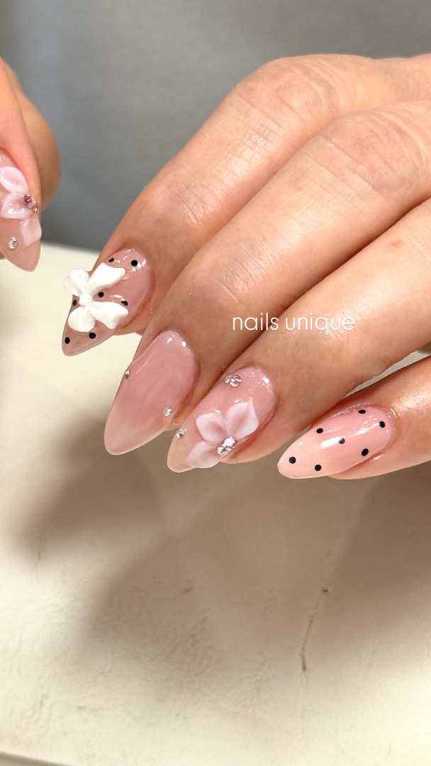 春らしい透明感のあるベージュピンクにリボンとドットがとても可愛らしく仕上がりました⭐︎